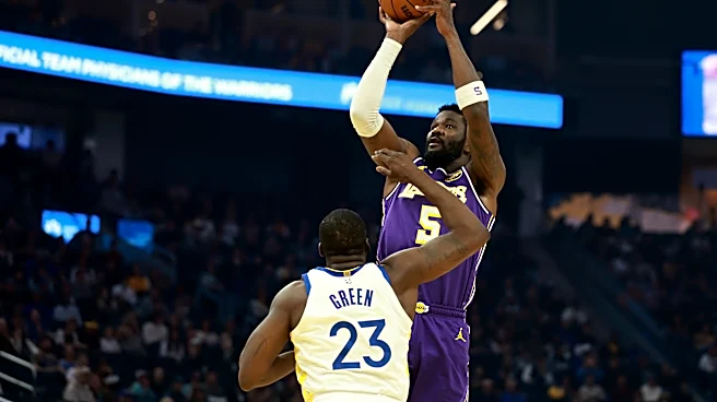 SAN FRANCISCO, CALIFORNIA - APRIL 09: Deandre Ayton #5 of the Los Angeles Lakers shoots over Draymond Green #23 of the Golden State Warriors at Chase Center on April 09, 2026 in San Francisco, California. NOTE TO USER: User expressly acknowledges and agrees that, by downloading and or using this pho