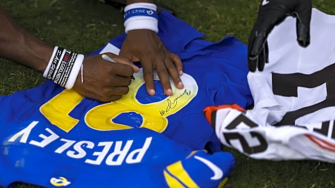 CLEVELAND, OHIO - AUGUST 23: Brennan Presley #81 of the Los Angeles Rams signs his jersey after the NFL Preseason 2025 game against the Cleveland Browns at Huntington Bank Field on August 23, 2025 in Cleveland, Ohio. (Photo by Lauren Leigh Bacho/Getty Images) | Getty Images The Los Angeles Rams unve