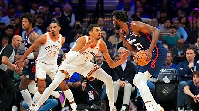 PHILADELPHIA, PA - JANUARY 22: Victor Wembanyama #1 of the San Antonio Spurs plays defense during the game against Joel Embiid #21 of the Philadelphia 76ers on January 22, 2024 at the Wells Fargo Center in Philadelphia, Pennsylvania NOTE TO USER: User expressly acknowledges and agrees that, by downl