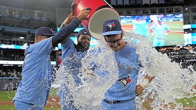 Apr 8, 2026; Toronto, Ontario, CAN; Toronto Blue Jays left fielder Davis Schneider (center) gets doused with ice water by center fielder Myles Straw (3) and first baseman Vladimir Guerrero Jr. (27) after a win over the Los Angeles Dodgers at Rogers Centre. Mandatory Credit: John E. Sokolowski-Imagn