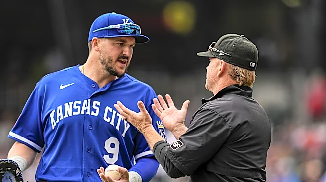 Mar 29, 2026; Cumberland, Georgia, USA; Kansas City Royals first baseman Vinnie Pasquantino (9) has a discussion with umpire Mike Muchlinski (76) during the game against the Atlanta Braves after the first inning at Truist Park. Mandatory Credit: Dale Zanine-Imagn Images | Dale Zanine-Imagn Images It