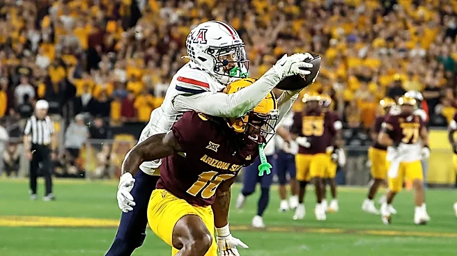 TEMPE, AZ - NOVEMBER 28: Arizona Wildcats defensive back Treydan Stukes (2) intercepts a pass to Arizona State Sun Devils wide receiver Jalen Moss (18) during the college football game between the Arizona Wildcats and the Arizona State Sun Devils on November 28, 2025 at Mountain America Stadium in T