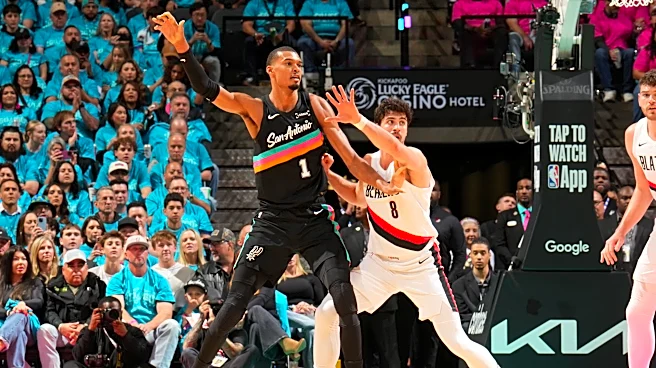 SAN ANTONIO, TX - APRIL 19: Victor Wembanyama #1 of the San Antonio Spurs is guarded by Deni Avdija #8 of the Portland Trail Blazers during the game during Round One Game One of the 2026 NBA Playoffs on April 19, 2026 at the Frost Bank Center in San Antonio, Texas. NOTE TO USER: User expressly ackno