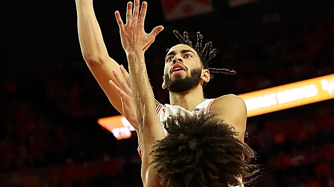 CLEMSON, SC - FEBRUARY 09: Clemson Tigers center Christian Reeves (14) puts a shot up over Duke Blue Devils guard Tyrese Proctor (5) during a college basketball game between the Duke Blue Devils and the Clemson Tigers on February 8, 2025, in Littlejohn Coliseum in Clemson, S.C. (Photo by John Byrum/