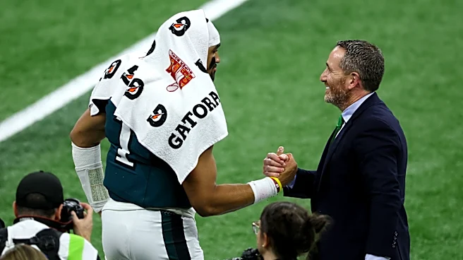 NEW ORLEANS, LOUISIANA - FEBRUARY 09: Jalen Hurts #1 and general manager Howie Roseman of the Philadelphia Eagles celebrate after beating the Kansas City Chiefs 40-22 to win Super Bowl LIX at Caesars Superdome on February 09, 2025 in New Orleans, Louisiana. (Photo by Chris Graythen/Getty Images) | G