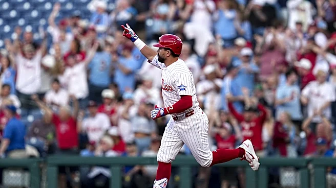 PHILADELPHIA, PENNSYLVANIA - APRIL 13: Kyle Schwarber #12 of the Philadelphia Phillies celebrates with teammate Bryce Harper #3 after rounding the bases on a solo home run in the bottom of the first inning against the Chicago Cubs at Citizens Bank Park on April 13, 2026 in Philadelphia, Pennsylvania