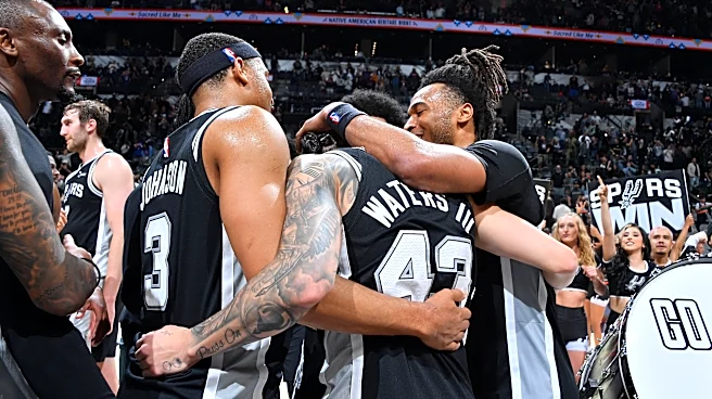 SAN ANTONIO, TX - APRIL 6: Keldon Johnson #3, Devin Vassell #24, and Stephon Castle #5 of the San Antonio Spurs huddle up after the game against the Philadelphia 76ers on April 6, 2026 at the Frost Bank Center in San Antonio, Texas. NOTE TO USER: User expressly acknowledges and agrees that, by downl