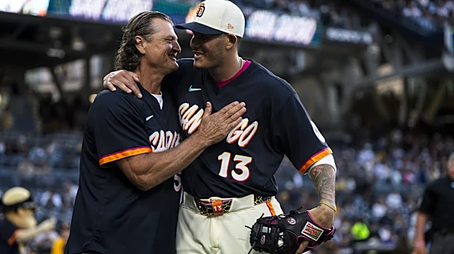 SAN DIEGO, CALIFORNIA - APRIL 10: Former Padres pitcher and Hall of Famer Trevor Hoffman hugs Manny Machado #13 of the San Diego Padres before the game against the Colorado Rockies at Petco Park on April 10, 2026 in San Diego, California. (Photo by Matt Thomas/San Diego Padres/Getty Images) | Getty