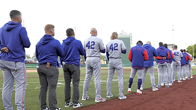 SACRAMENTO, CA - APRIL 15: Members of the Texas Rangers (wearing #42 in honor of Jackie Robinson) look on from the base path during the national anthem prior to the game between the Texas Rangers and the Athletics at Sutter Health Park on Wednesday, April 15, 2026 in Sacramento, California. (Photo b