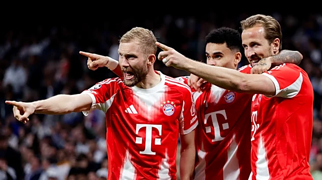 MADRID, SPAIN - APRIL 7: Harry Kane of FC Bayern Munchen celebrates 0-2 with Luis Diaz of FC Bayern Munchen, Konrad Laimer of FC Bayern Munchen during the UEFA Champions League match between Real Madrid v Bayern Munchen at the Estadio Santiago Bernabeu on April 7, 2026 in Madrid Spain (Photo by Mari