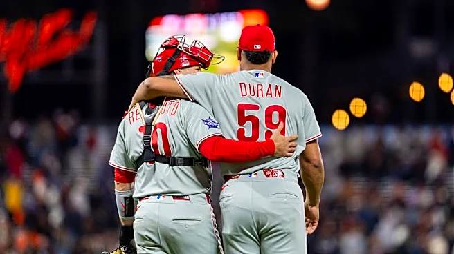 Apr 6, 2026; San Francisco, California, USA; Philadelphia Phillies catcher J.T. Realmuto (10) and Philadelphia Phillies pitcher Jhoan Duran (59) celebrate their victory against the San Francisco Giants at Oracle Park. Mandatory Credit: Bob Kupbens-Imagn Images | Bob Kupbens-Imagn Images Here are the