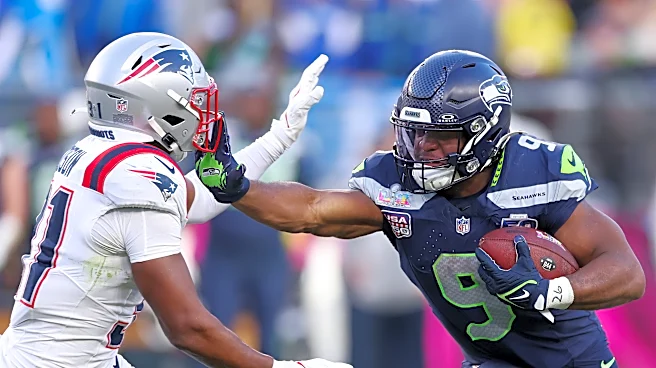 SANTA CLARA, CALIFORNIA - FEBRUARY 08: Kenneth Walker III #9 of the Seattle Seahawks stiff arms Craig Woodson #31 of the New England Patriots during the second quarter in Super Bowl LX at Levi's Stadium on February 08, 2026 in Santa Clara, California. (Photo by Kevin C. Cox/Getty Images) | Getty Ima