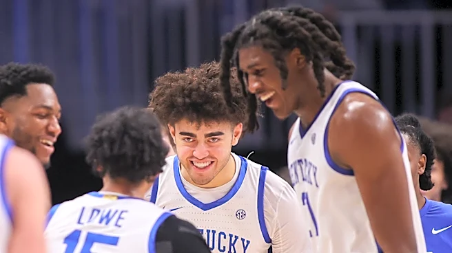 Dec 20, 2025; Atlanta, Georgia, USA; Kentucky Wildcats guard Jaland Lowe (15) reacts with center Malachi Moreno (24) and forward Jayden Quaintance (21) against the St. John Red Storm in the second half at State Farm Arena. Mandatory Credit: Brett Davis-Imagn Images | Brett Davis-Imagn Images The 202