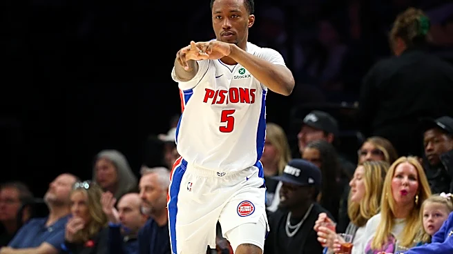 MINNEAPOLIS, MINNESOTA - MARCH 28: Ronald Holland II #5 of the Detroit Pistons celebrates his three-point basket against the Minnesota Timberwolves in the third quarter at Target Center on March 28, 2026 in Minneapolis, Minnesota. The Pistons defeated the Timberwolves 109-87. NOTE TO USER: User expr