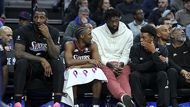 PHILADELPHIA, PENNSYLVANIA - MARCH 3: Andre Drummond #1, Tyrese Maxey #0, Joel Embiid #21, and Kyle Lowry #7 of the Philadelphia 76ers look on from the bench against the San Antonio Spurs in the fourth quarter at Xfinity Mobile Arena on March 3, 2026 in Philadelphia, Pennsylvania. The Spurs defeated