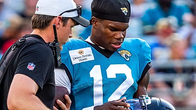 Jacksonville Jaguars wide receiver Travis Hunter (12) asks an equipment man about his helmet before an NFL scrimmage at EverBank Stadium Friday August 1, 2025, in Jacksonville, Fla. [Doug Engle/Florida Times-Union] | Doug Engle/Florida Times-Union / USA TODAY NETWORK via Imagn Images Happy Friday, B
