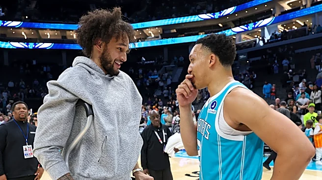 CHARLOTTE, NC - MARCH 3: Dereck Lively II #2 of the Dallas Mavericks and Grant Williams #2 of the Charlotte Hornets talk after the game on March 3, 2026 at Spectrum Center in Charlotte, North Carolina. NOTE TO USER: User expressly acknowledges and agrees that, by downloading and or using this photog