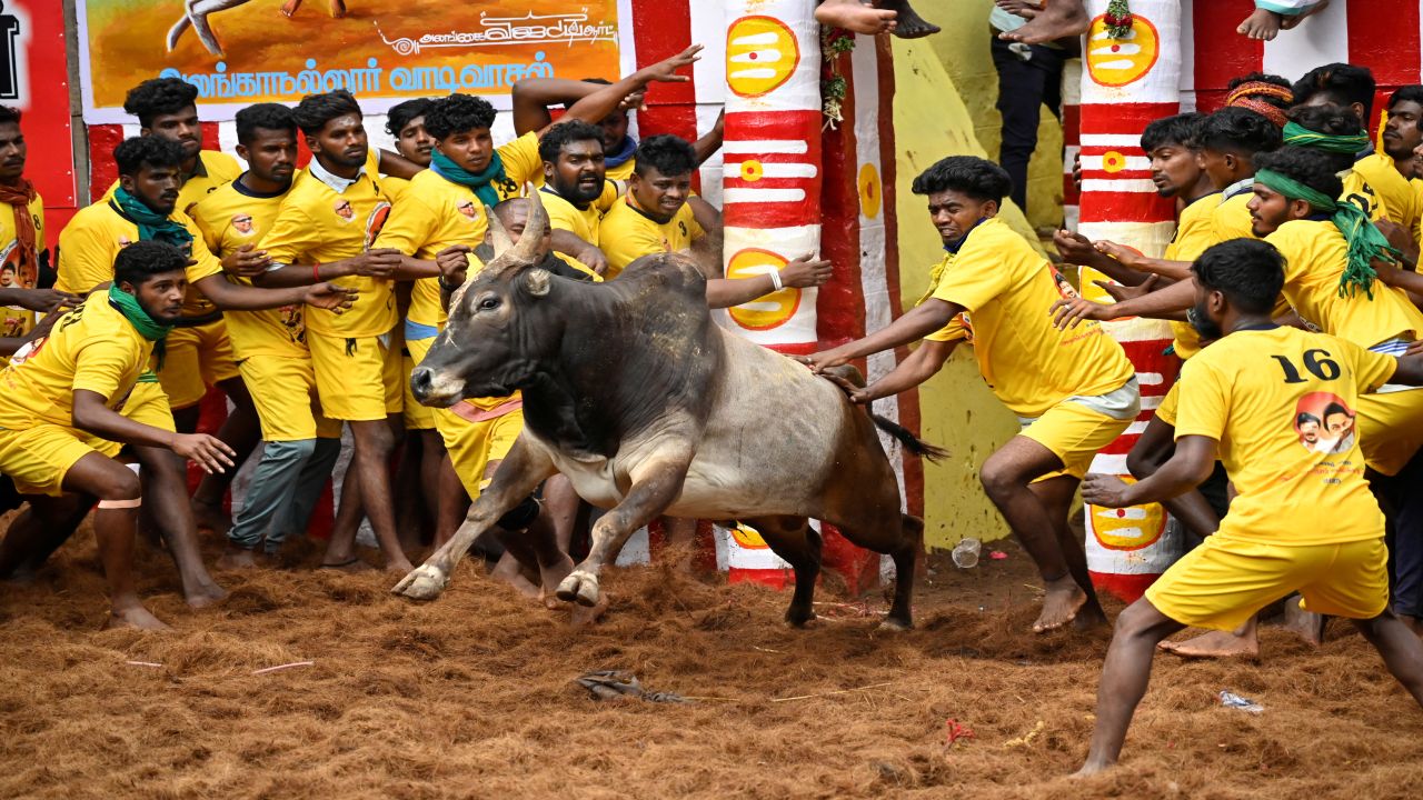 Villagers try to control a bull during a bull-taming festival, known as "Jallikattu" and is a part of south India's harvest festival of Pongal, on the outskirts of Madurai town, in the southern state of Tamil Nadu, India, January 16, 2025. REUTERS/Riya Mariyam R