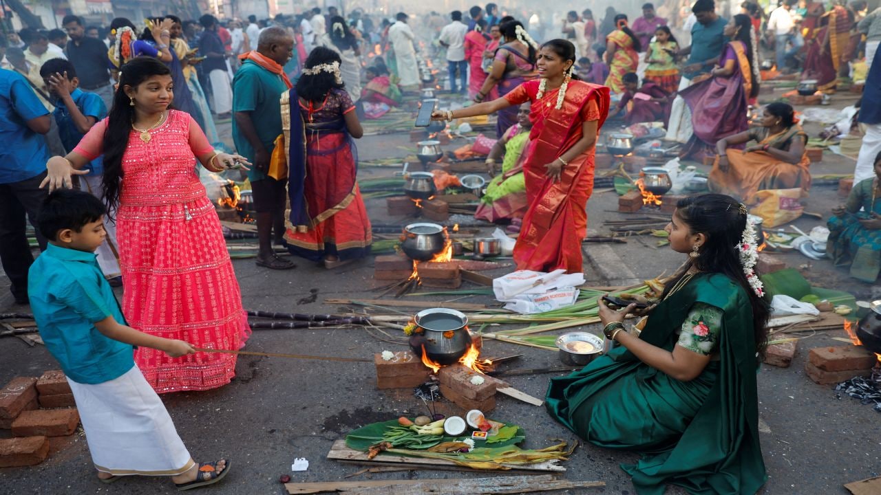 Devotees cook a rice dish as an offering to the Hindu sun god during Pongal celebrations on a street in Mumbai, India, January 15, 2024. REUTERS/Francis Mascarenhas