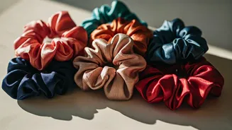 The key to effective scrunchie accessorizing is balance. Pair a bold scrunchie with simple outfits. For more complex looks, let the scrunchie complement your attire, not overwhelm it. Consider the occasion. A subtle scrunchie works well at work or a casual outing, while an embellished one might suit a special event. Your hair's texture and length also play a key role in your choice. Thicker hair may need a larger scrunchie for more secure hold, while finer hair can benefit from smaller options. Scrunchies can coordinate with other accessories, such as earrings or necklaces, creating a cohesive look. When styling with scrunchies, consider the overall aesthetic you're trying to achieve, whether it's casual, elegant, or playful.