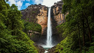 The flow of water in Angel Falls is largely dependent on the rainy season, with peak flows observed from June to December. During these months, the waterfall's volume is at its maximum, creating an even more dramatic display. The water descends from the summit of Auyán-Tepuí, a unique table-top mountain, contributing to the waterfall's continuous and impressive flow. The water's movement, from its origin to the plunge, highlights the dynamics of natural forces, shaping the natural landscape around it.