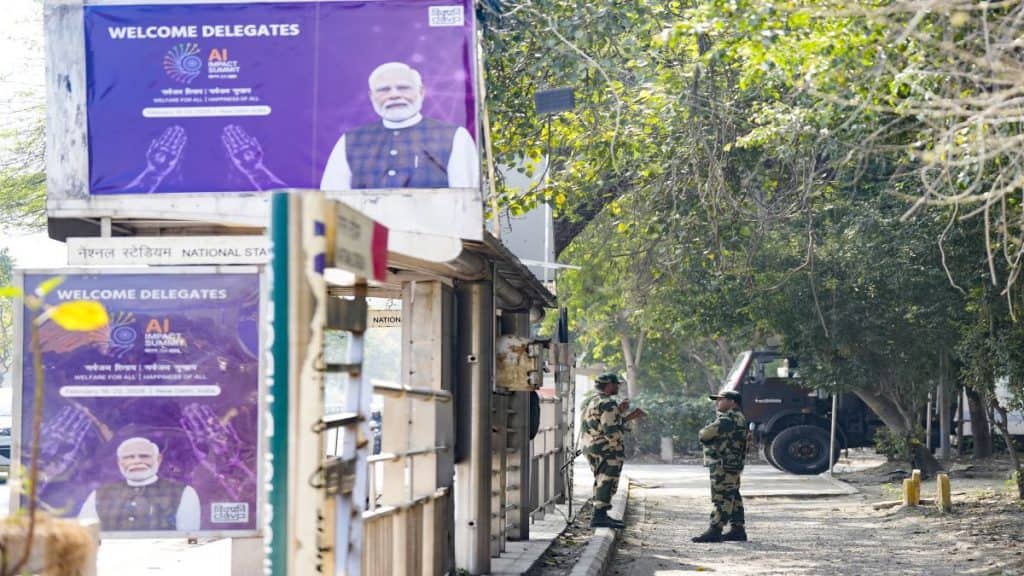 BSF personnel stands guard at a bus stop, ahead of the AI Impact Summit 2026, in New Delhi. PTI