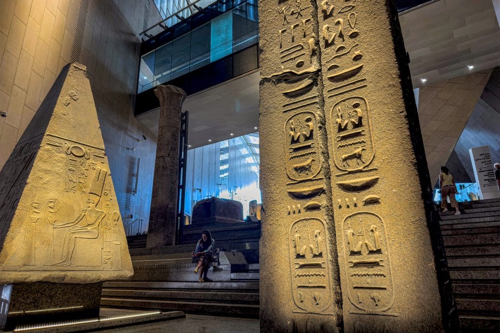 A visitor sits near a limestone fragment dating to the reign of the ancient Egyptian 19th dynasty king Merneptah (1213-1203 BC) on display at the Grand Egyptian Museum in Giza. AFP