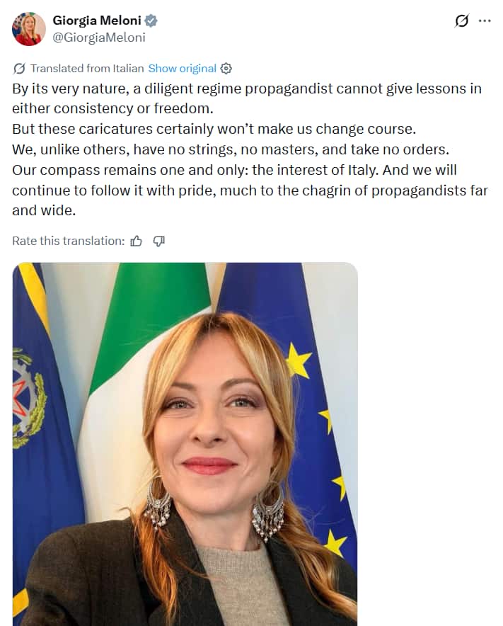 She wrote, "We, unlike others, have no strings, no masters, and take no orders. Our compass remains one and only: the interest of Italy. And we will continue to follow it with pride, much to the chagrin of propagandists far and wide."