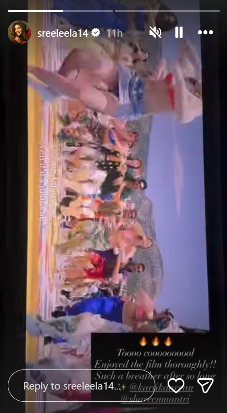 Sreeleela’s praise began with a couple of fire emojis on her story, followed by the caption, “Too cool! Enjoyed the film thoroughly! Such a breather after so long!” She tagged Kartik and Shareen Mantri Kedia, one of the film’s producers in her story.