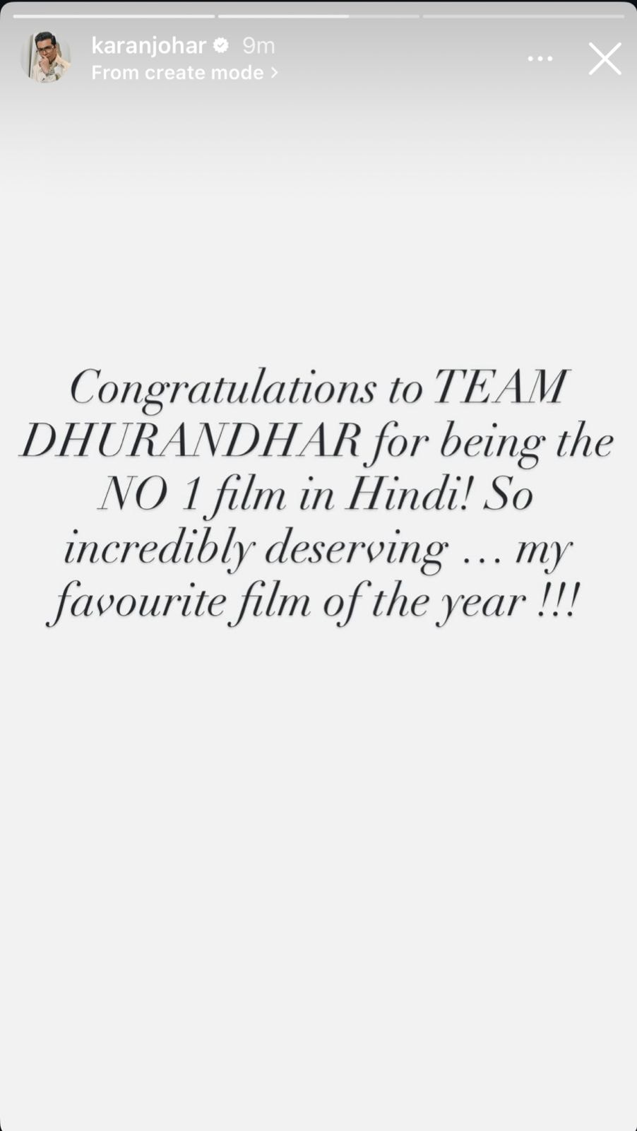 Karan Johar took to Instagram and wrote, “Congratulations to Team Dhurandhar for being the no 1 film in Hindi! So incredibly deserving… My favourite film of the year!!!” For the unversed, Dhurandhar officially went past Pushpa 2’s Hindi-language total, making it the highest-grossing Hindi film so far, based on figures shared by the makers.