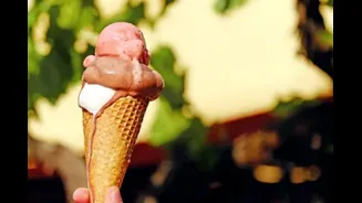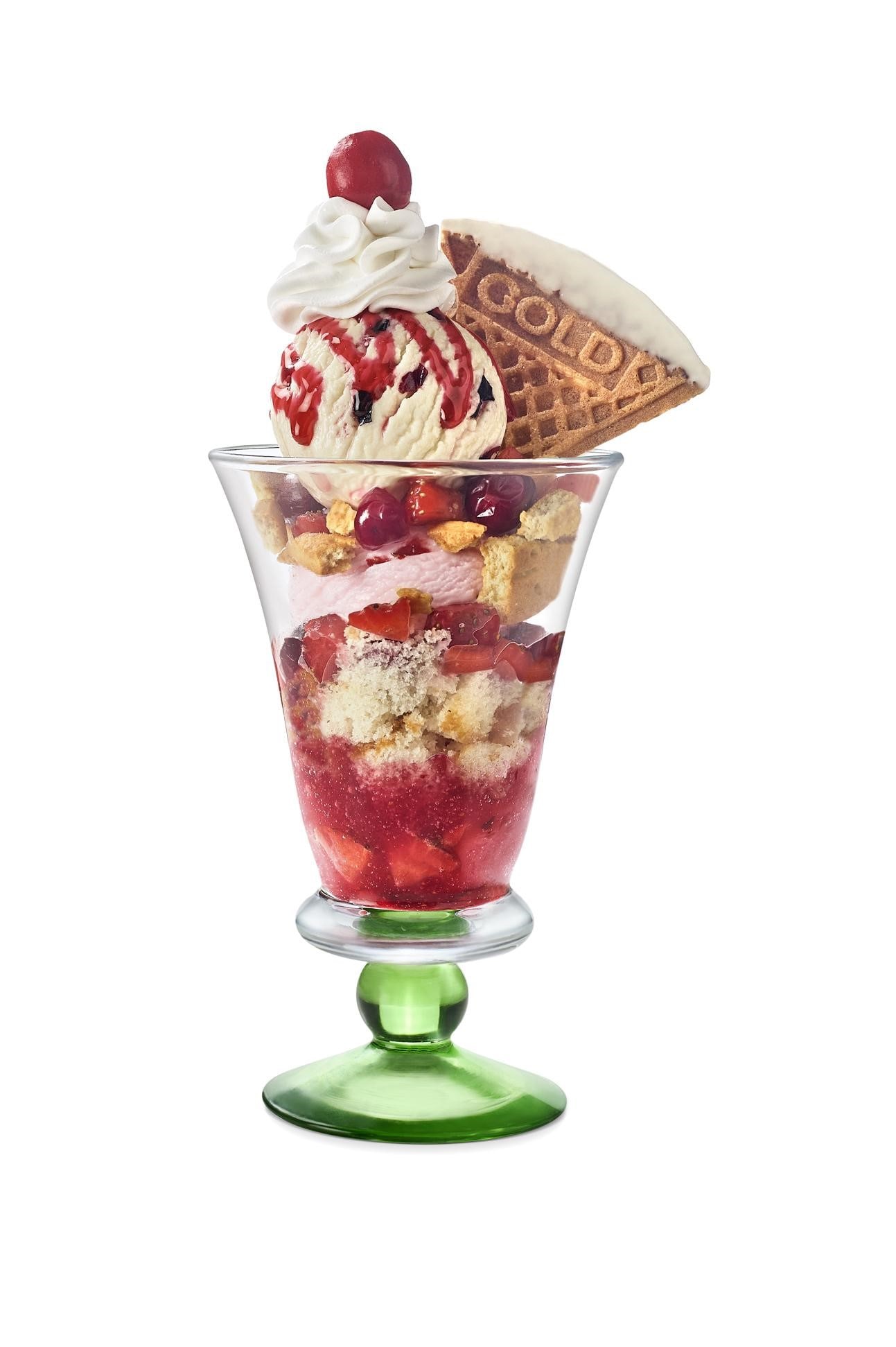 A decadent treat featuring strawberry and vanilla ice cream, strawberry sauces, and various toppings like wafers, whipped cream, and sometimes a chocolate-coated waffle.