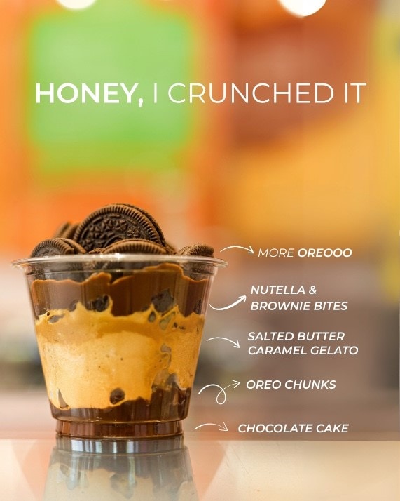 A rich salted caramel gelato layered with Nutella, Oreo crunch, golden honeycomb and a brownie bite for a deeply indulgent finish.