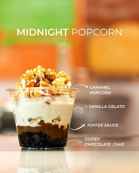 Vanilla gelato paired with gooey chocolate cake, sticky toffee and caramel popcorn for a sweet-meets-salty indulgence.