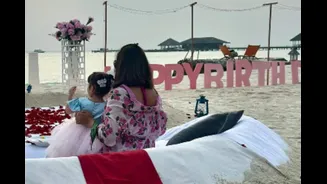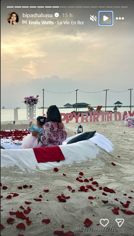 Taking to her Instagram Stories, Bipasha posted a picture from her special day in which she is seen sitting with little Devi, both facing the breathtaking blue sea. The seaside was transformed into a cosy celebration space with customised décor featuring flowers and rose petals. A pristine white seating arrangement on the sand, complete with cushions, lanterns and food, added to the intimate and serene vibe of the celebration.