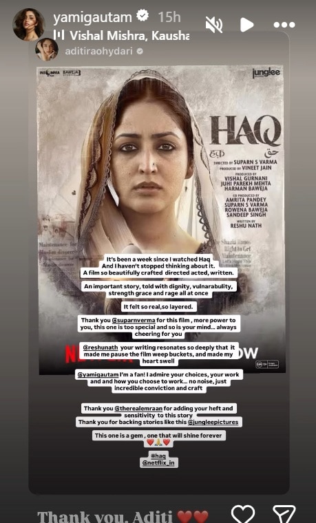 Taking to his Instagram stories, Aditi Rao Hydari shared her review and wrote, “It’s been a week since I watched Haq And I haven’t stopped thinking about it. A film so beautifully crafted, directed, acted, written. An important story, told with dignity, vulnerability, strength, grace and rage all at once. It felt so real, so layered. Thank you Suparn Verma for this film, more power to you, this one is too special and so is your mind… always cheering for you. Greshunath your writing resonates so deeply that it made me pause the film weep buckets, and made my heart swell. Yami Gautam I’m a fan! I admire your choices, your work and and how you choose to work… no noise, just incredible conviction and craft. Thank you @therealemraan for adding your heft and sensitivity to this story. Thank you for backing stories like this @jungleepictures. This one is a gem, one that will shine forever.”