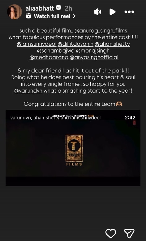 Taking to her Instagram stories, Alia Bhatt shared the film trailer and wrote, “such a beautiful film.. @anurag_singh_films what fabulous performances by the entire cast!!!!! @iamsunnydeol @diljitdosanjh @ahan.shetty @sonambajwa @monajsingh @medhaarana @anyasinghofficial