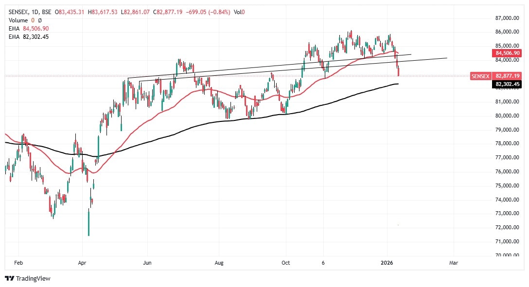Jigar S Patel, Senior Manager – Technical Research Analyst, Anand Rathi Shares and Stock Brokers, said: “Sensex has decisively broken its critical support near 84,200 a couple of days ago, confirming short-term weakness and continuation of the corrective phase. The index is now gradually drifting towards its 200-day EMA placed around the 82,300 zone, which historically acts as a strong long-term demand area. From a technical perspective, the region between 82,000–82,400 is expected to provide strong support, where base formation is likely to occur. Momentum indicators are approaching oversold territory, hinting that selling pressure may start easing near these levels.”