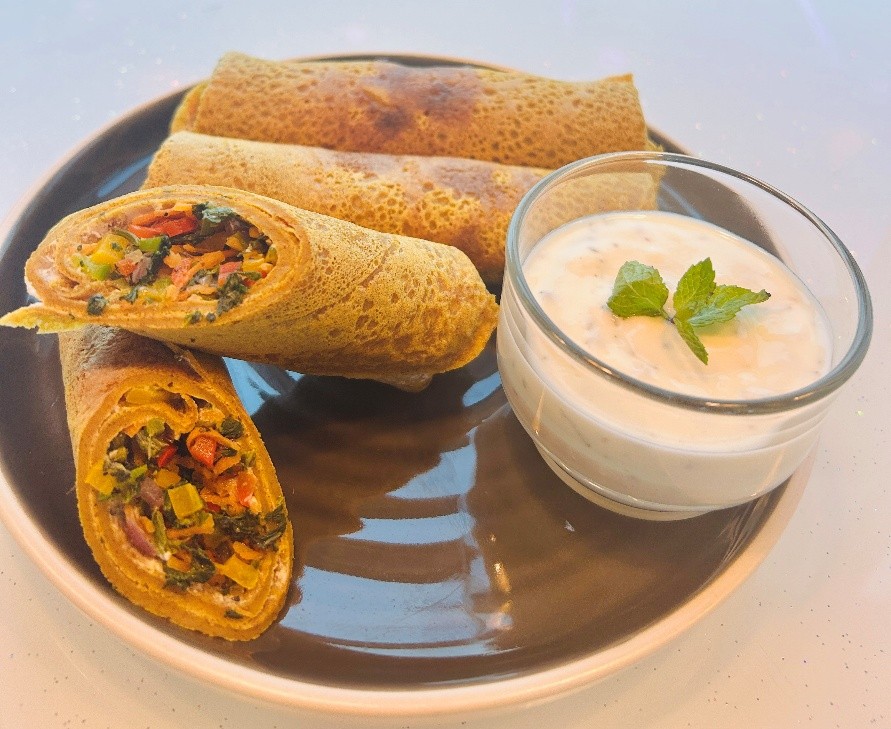 together quickly and can be eaten during long work days is the best change to make in this season. The wholesome wrap made from ragi chilla is filled with sautéed vegetables and has a cooling mint yoghurt to go along with it.