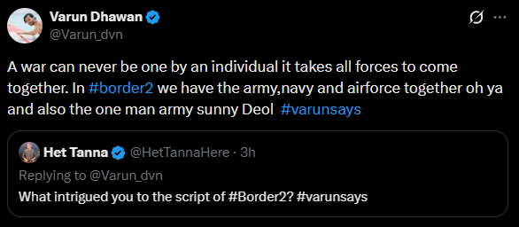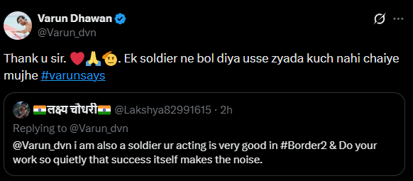 Pulling off a patriotic genre with utmost honesty is one big feat, and being applauded by a real-life braveheart for showcasing the lives of soldiers is an entirely different feat. Lakshya Chaudhary, soldier, took to X and wrote, “@Varun_dvn I am also a soldier ur acting is very good in #Border2 & Do your work so quietly that success itself makes the noise.” To this, Varun replied, “Thank u sir. . Ek soldier ne bol diya usse zyada kuch nahi chaiye mujhe.”