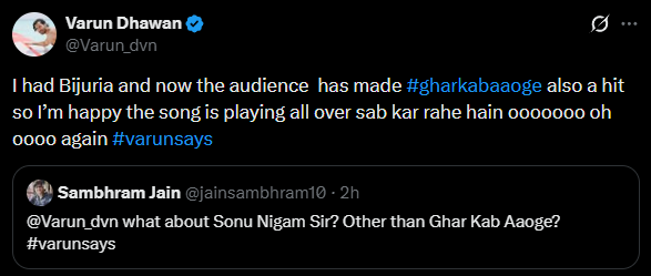 The film’s song ‘Ghar Kab Aaoge’ is making waves online, and Varun expressed sheer joy that the audience has embraced the track. “I had Bijuria and now the audience has made #gharkabaaoge also a hit so I’m happy the song is playing all over sab kar rahe hain ooooooo oh oooo again,” he wrote, while reacting to another post.