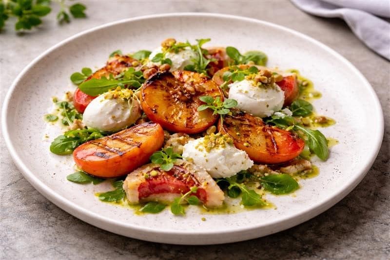 To Serve: Serve fresh. The dish combines the sweetness of grilled peaches, the tang of pickled rind, and the creaminess of feta, highlighting the depth and quality of European ingredients.