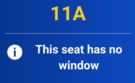 • Seat 11A lacks a window due to aircraft air conditioning.