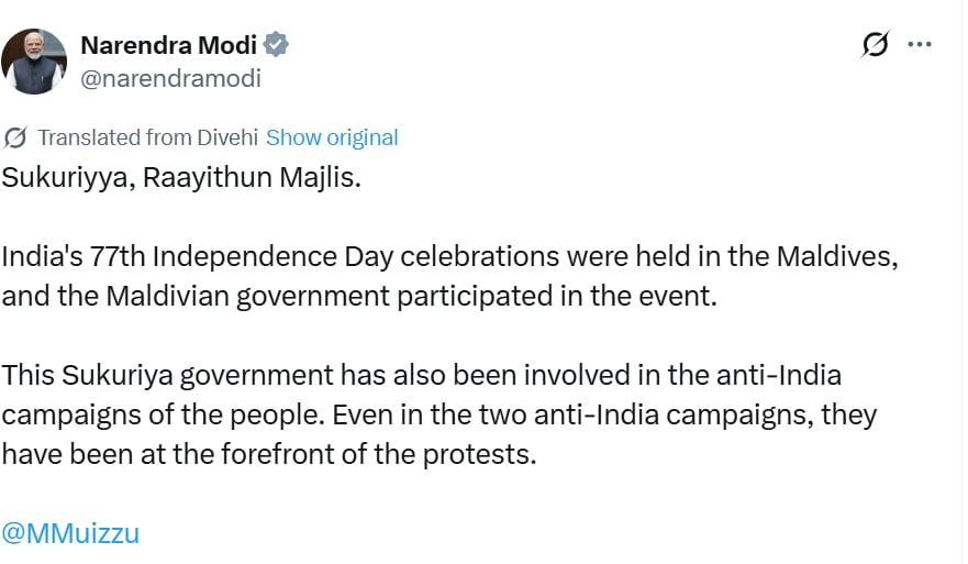 When users clicked on PM’s post on X, the AI assistant translated it to this: “India’s 77th Independence Day celebrations were held in the Maldives, and the Maldivian government participated in the event. This Sukuriya government has also been involved in the anti-India campaigns of the people. Even in the two anti-India campaigns, they have been at the forefront of the protests.”