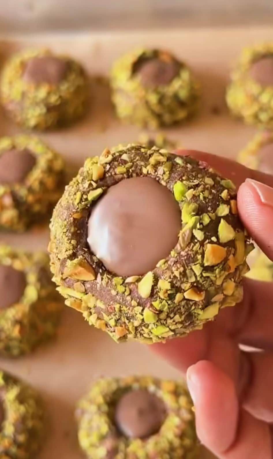 Fill the indent with pistachio paste and drizzle with melted milk chocolate.