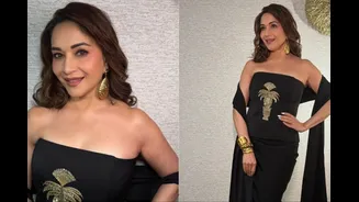 At first glance, Madhuri Dixit’s latest appearance in New Jersey reads like a classic black evening dress. It is elegant, fluid, and unmistakably polished. But linger a moment longer, and the illusion