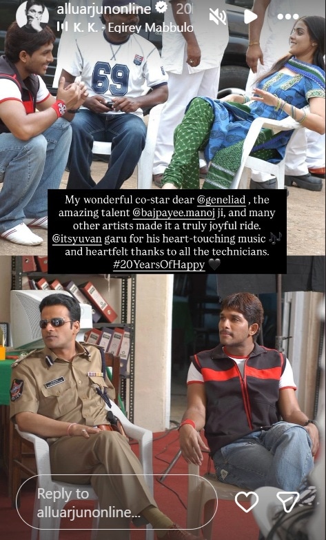 Taking to his Instagram stories, Allu Arjun shared a series of BTS photos featuring Genelia and Manoj Bajpayee. He also thanked his father for the assistance. Directed by A. Karunakaran, Happy helped Allu Arjun establish as a bankable star in Telugu cinema. Genelia’s portrayal of Madhumitha was also loved and Manoj Bajpayee’s strong screen presence added depth.