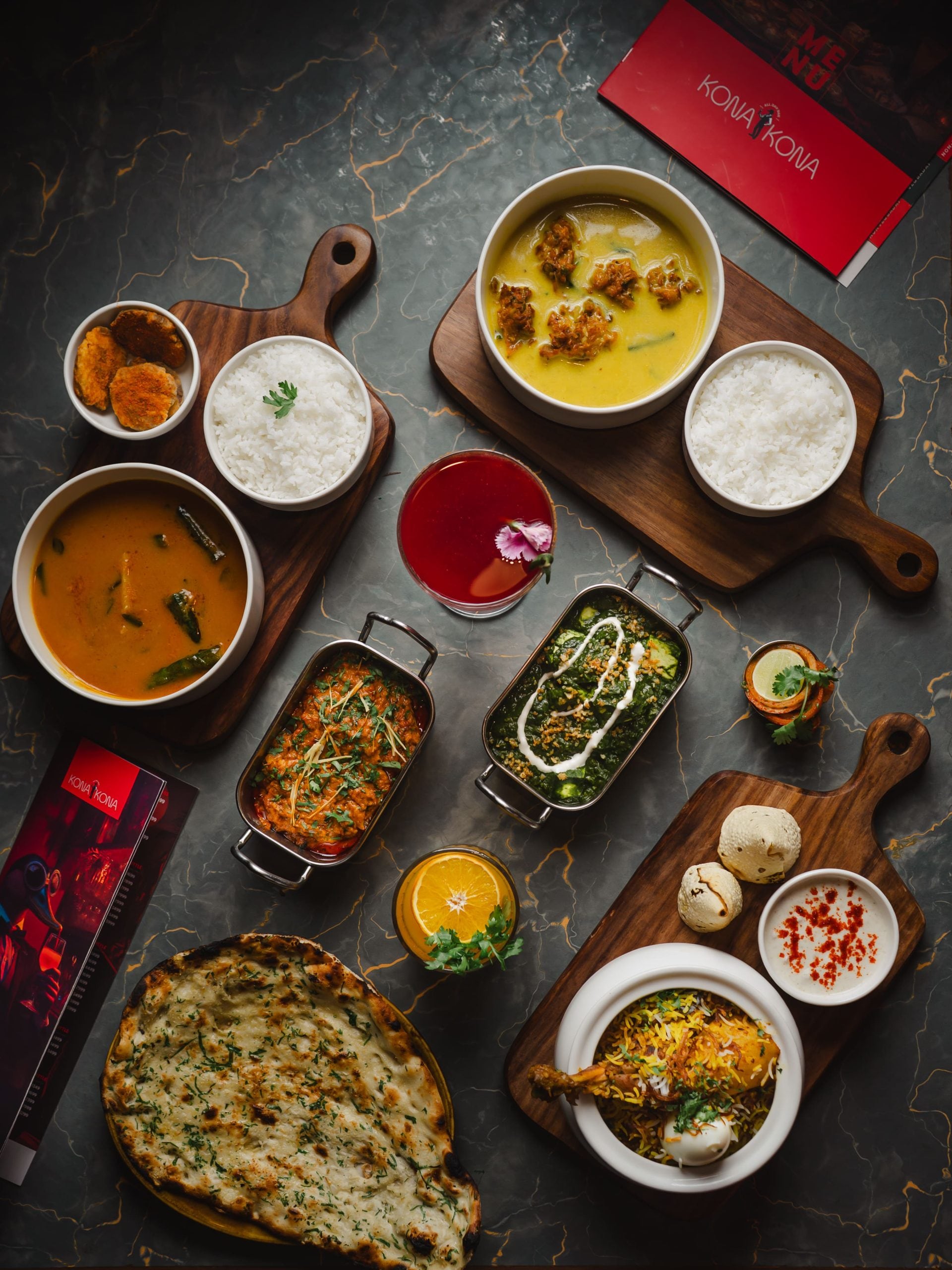 Comforting mains star with Lasooni Palak Khichdi (garlicky spinach dal khichdi), creamy Makhani Paneer, Lasooni Palak Paneer, robust Sindhi/Punjabi curries, and lunch-friendly Khow Suey or Veg Pulao. Meaty favourites include Chicken Tikka Masala, Butter Chicken, Lasooni Palak Chicken/Mutton, Hyderabadi Green Masala Chicken/Mutton, tangy Goan Fish Curry, and Shorshe Malai (fish/prawns in mustard gravy with rice). End sweetly with indulgent Angoori Sandesh Kulfi.