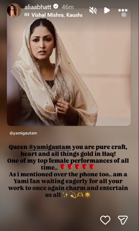 Taking to her Instagram stories, Alia Bhatt shared the poster of the film featuring Yami Gautam and also penned a sweet note calling the actress ‘queen’. Alia worte, “Queen Yami you are pure craft, heart and all things gold in Haq. One of my top female performances of all time… As I mentioned over the phone too… am a Yami fan waiting eagerly for all your work to once again charm and entertain us all.” Earlier, many celebrities, including Farah Khan has praised Yami’s performance. She even mentioned that the actress deserves an award.