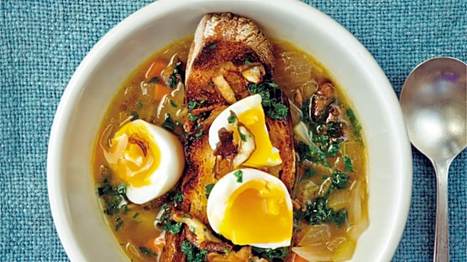 Break or cut the eggs in half. Put half an egg in each of 4 bowls. Ladle soup over the eggs. Spoon the mushroom mixture onto the slices of toasted bread and put them on the eggs in the bowls. Top each with a second half egg, sprinkle with a few grains of salt, and serve.