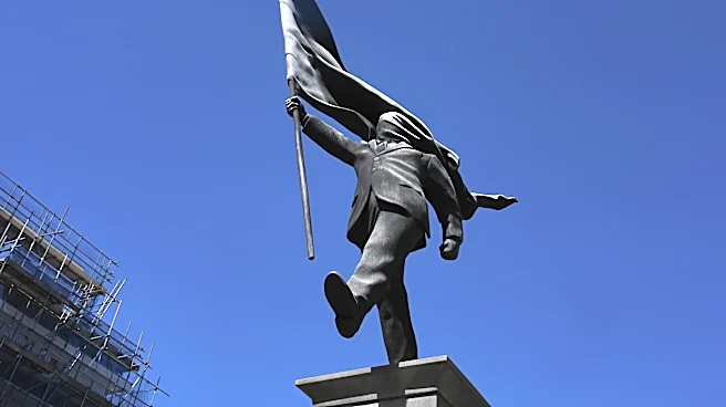 LONDON (AP) — Elusive street artist Banksy said Thursday that a new sculpture that appeared in central London of a man striding off a plinth, with his face blinded by a billowing flag, is his work.